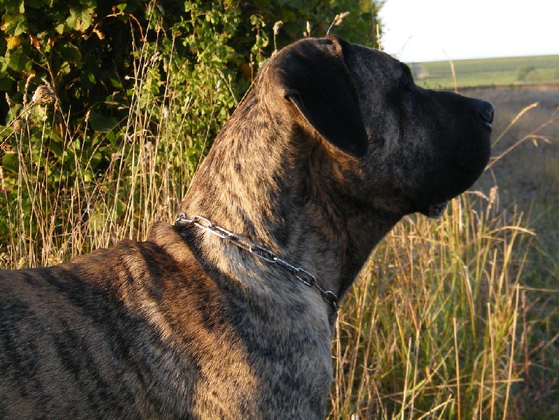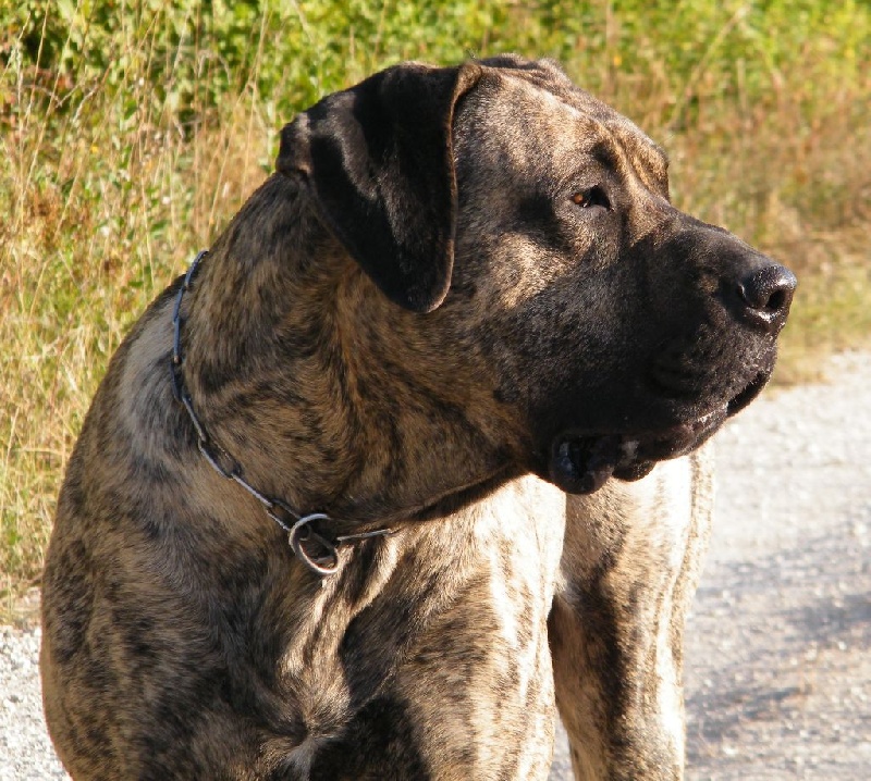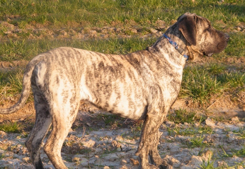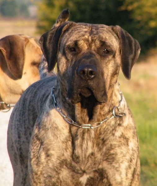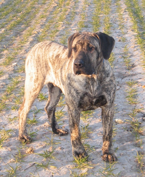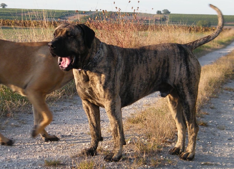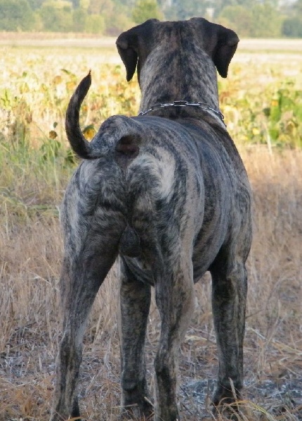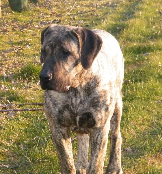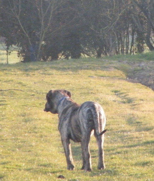 Poitrine aux coudes, les cotes doivent encore s'arrondir. Belle encolure, fanon typique, Jolie tète avec un bel oeil foncé. EXC.masque, museau bien tronqué de bonne longueur par rapport au crane déjà large. Masséters marquées, belles babines, oreilles bien attachées. EXC. allures