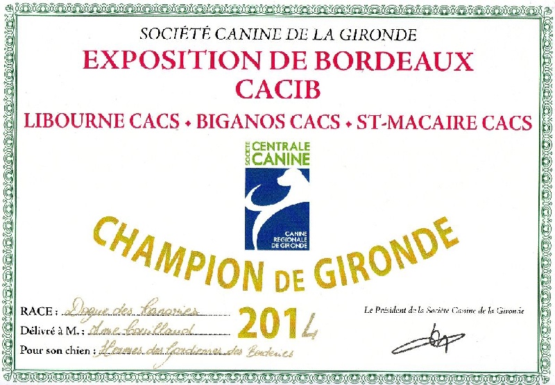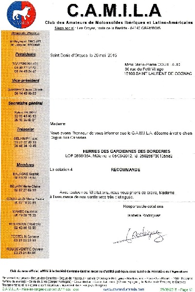 Hermès est "Champion de France Puppy" (titre honorifique) Il est 2ème Meilleur Puppy du Championnat de France àMarseille, toutes races confondues de la journée du samedi ( 35 sur le ring d'honneur). Hermès est devenu VICE-CHAMPION D'EUROPE Jeune 2013 à Genève (Titre honorifique, mais qui fait plaisir !!) Meilleur Jeune de sa race et Meilleur Jeune du CAMILA lors de la NATIONALE D'ELEVAGE 2013 à NEVERS!!!!!! Il est Champion de France Jeune 2013 ( titre honorifique ) CHAMPION JEUNE du Club CAMILA 2013 ( titre honorifique )CHAMPION de Gironde 2014 et Meilleur Champion de Gironde 2014 du groupe 2 sur le ring d'honneur lors de l'expo à Bordeaux le 18/01/2015 ( titre honorifique ) VICE-CHAMPION de FRANCE 2015 !! ( Titre honorifique )CHAMPION du club de race CAMILA 2014 !