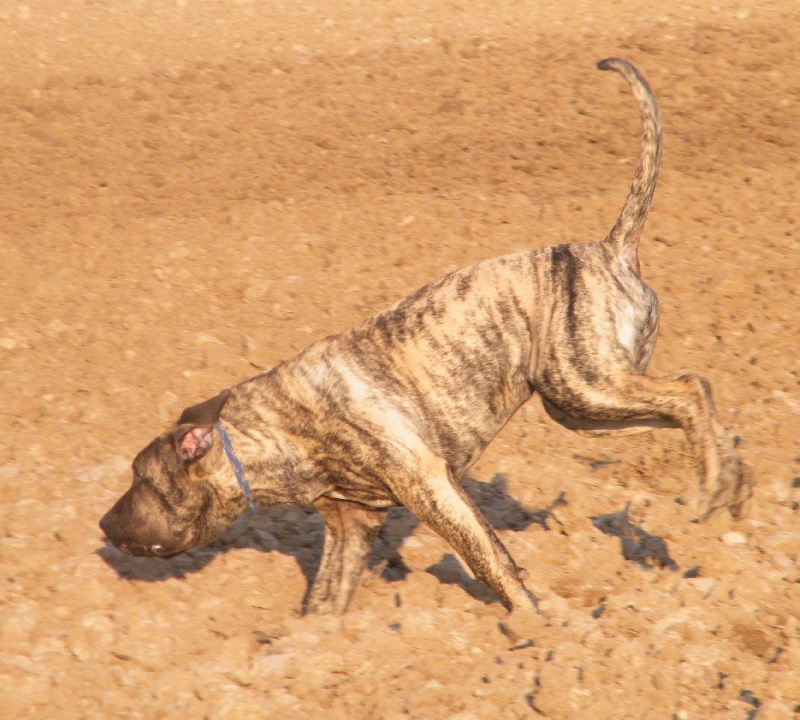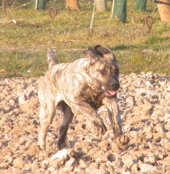 2ans 1/2. Dans la fourchette de taille. Bien typé, la tète doit s'éclater. EXC. rapport crane/museau,belle ligne et expression. Zygomatiques bien développés. Un peu court dans ses proportions. EXC. dessus, belle ossature. Poitrine un peu légère. EXC. aplombs. Très belle couleur de robe. Pieds un peu longs. DCC. Cuisses bien gigotées. EXC. mouvement de profil. Joli masque.